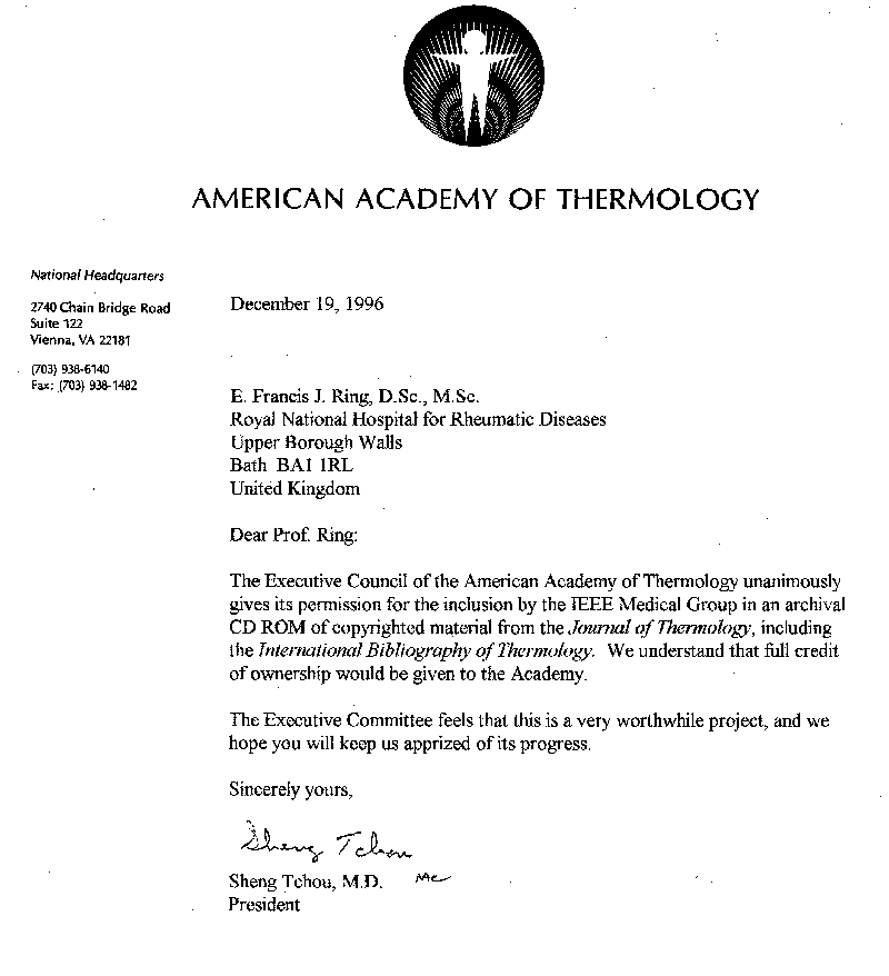 The T.I. ArchiveUpon his retirement from the University of South Wales in 2018, former EAT President Prof. Francis Ring gifted a large selection of books on thermology and thermal physiology to the current EAT President. This collection includes historically important textbooks and proceedings, many of which are now out of print. These documents now form "The Francis Ring Library of Thermology" and can be viewed on request.
